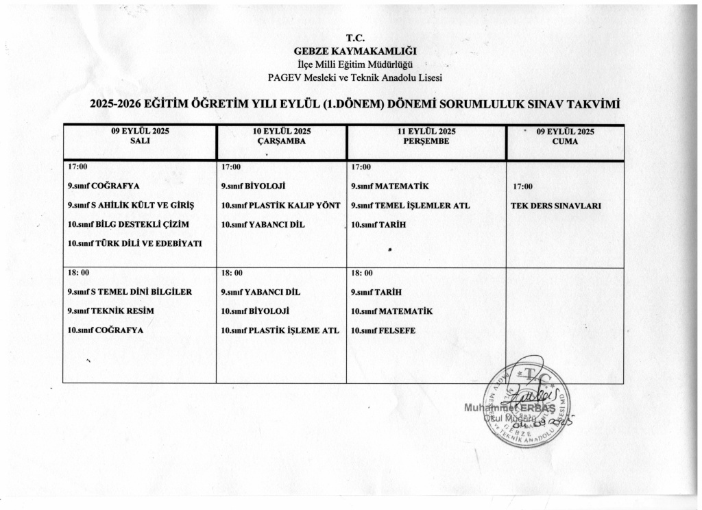 2025-2026 EĞİTİM ÖĞRETİM YILI EYLÜL DÖNEMİ SORUMLULUK SINAVLARI AŞAĞIDAKİ TAKVİM DOĞRULTUSUNDA YAPILACAK OLUP, BU SINAVLAR NETİCESİNDE DE TAKVİMDE BELİRTİLEN TARİHTE DE TEK DERS SINAVI YAPILACAKTIR.